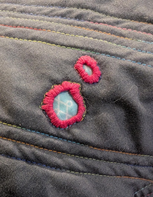 Oh, and I had already spent some extra time before quilting it to patch a hole on the backing in an interesting way.