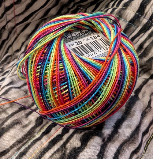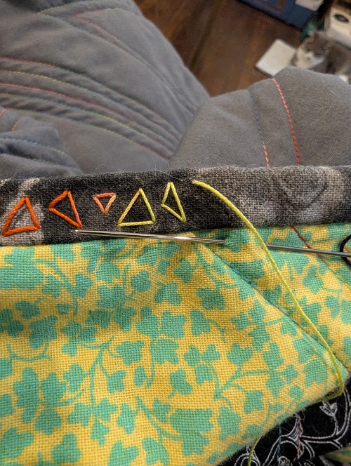 Then for some reason, the same strange and silly reasons that possessed me before I decided to add some abstract stitched triangles along the binding. And this was after hand stitching the binding on... I initially went with my trusty rainbow sewing thread but it was taking forever so I knew something had to change. Instead of giving up on the endeavor I went out to the local needle crafts shop and found some awesome rainbow cotton crochet thread. The process is still slow but I'm re-framing how I think about it as "engaging in mindful slow stitching" instead of "wasting time on an ugly quilt". I'm sure I'll love it more once it is complete but right now the backside is my favorite.