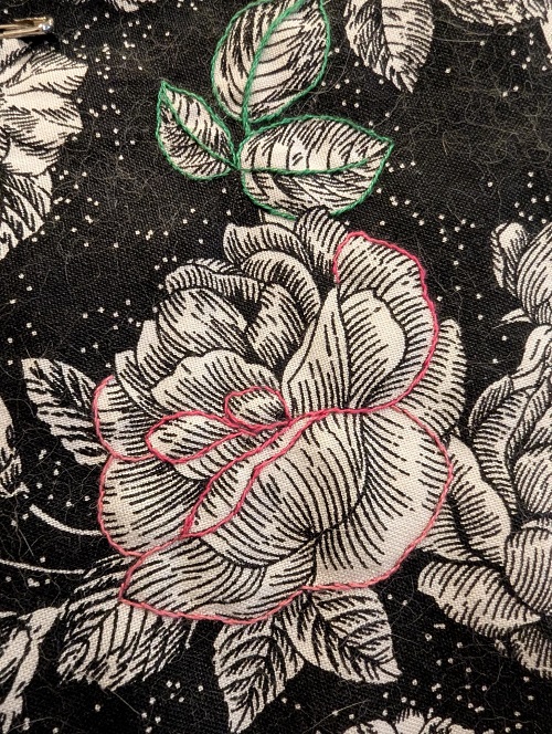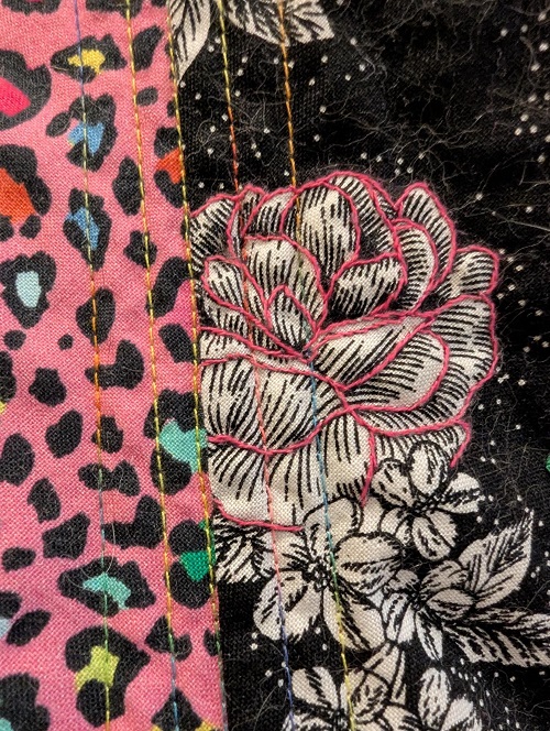 Then for some reason, some strange reason, some silly reason... I decided to add embroidery around edges of zebra stripes and around floral motifs. The pace on this has been slow going and I decided to wrap up the embroidery near the edges of the quilt so I could at least trim and bind it already.